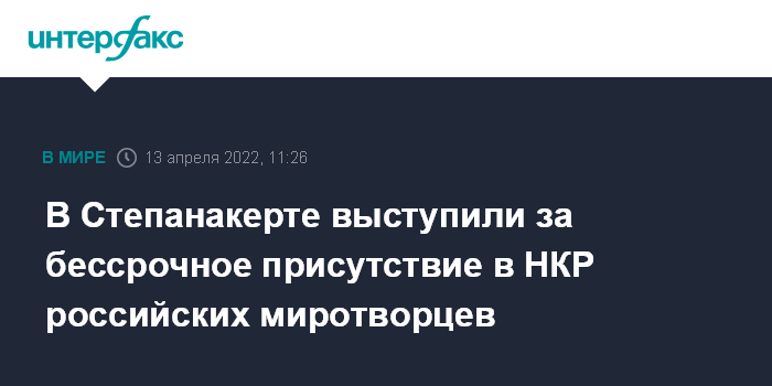 Москва. 13 апреля. INTERFAX.RU - Глава непризнанной Нагорно-Карабахской республики (НКР) Араик Арутюнян заявил о необходимости бессрочного присутствия в НКР российских миротворцев.