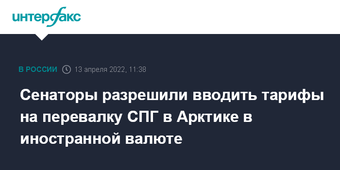 Москва. 13 апреля. INTERFAX.RU - Совет Федерации поддержал закон № 11945-8, который позволяет устанавливать в иностранной валюте тарифы на услуги по погрузке, выгрузке и хранению в морских портах сжиженного природного газа (СПГ), произведенного в Арктической зоне России.