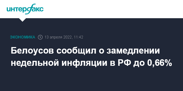 Москва. 13 апреля. INTERFAX.RU - Инфляция в России за последнюю неделю (со 2 по 8 апреля - ИФ) замедлилась до 0,66%, сообщил первый вице-премьер РФ Андрей Белоусов, выступая в Совете Федерации.
