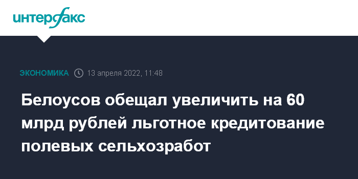 Белоусов обещал увеличить на 60 млрд рублей льготное кредитование полевых сельхозработ