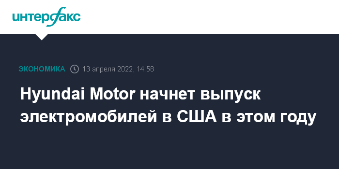 Москва. 13 апреля. INTERFAX.RU - Южнокорейский автопроизводитель Hyundai Motor Co начнет производство электромобилей на своем предприятии в США в этом году.