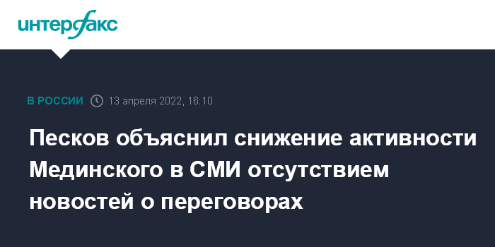 Москва. 13 апреля. INTERFAX.RU - Снижение медийной активности главы российской делегации на переговорах с Украиной Владимира Мединского связано с тем, что пока нет новостей о ходе переговорного процесса, пояснил пресс-секретарь президента РФ Дмитрий Песков.