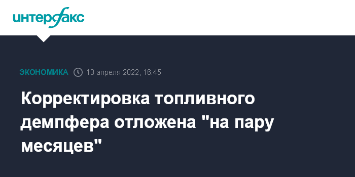 Москва. 13 апреля. INTERFAX.RU - Ведомства отложили корректировку топливного демпфера "на пару месяцев", потому что пока рынок нефтепродуктов профицитен, сообщил журналистам замглавы Минфина Алексей Сазанов.