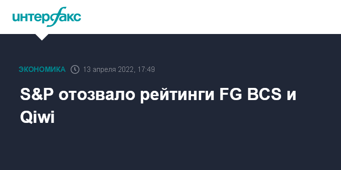 Москва. 13 апреля. INTERFAX.RU - Международное рейтинговое агентство S&P Global Ratings отозвало кредитные рейтинги FG BCS Ltd., холдинговой компании Финансовой группы "БКС", ее операционных подразделений - BrokerCreditService (Cyprus) Ltd., BrokerCreditService Structured Products Plc и BCS Prime Brokerage Ltd., а также Qiwi.