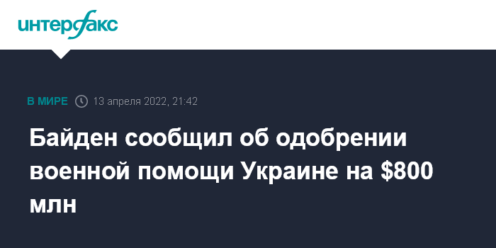 "Я только что поговорил с президентом Зеленским и сказал ему, что моя администрация одобряет дополнительную помощь Украине на $800 млн в виде оружия, амуниции и прочей помощи в области безопасности", - говорится в заявлении Байдена с сайта Белого дома.