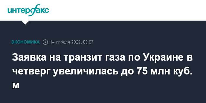 Как свидетельствуют данные "Оператора ГТС Украины", номинация на прокачку российского газа в Европу на 14 апреля составляет 74,6 млн куб. м, заявка на 13 апреля была 66,3 млн куб. м.