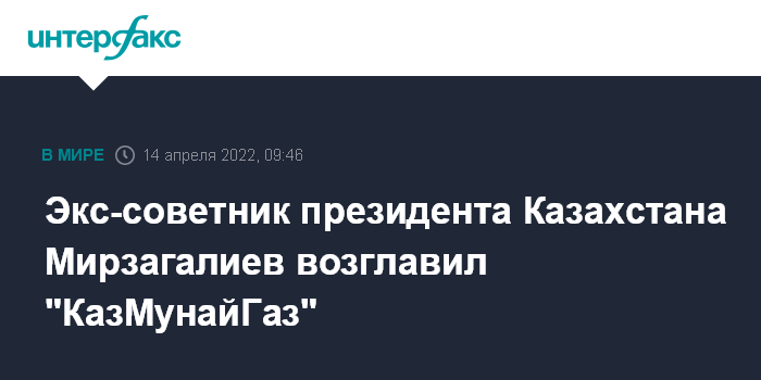 Москва. 14 апреля. INTERFAX.RU - Бывший советник президента Казахстана Магзум Мирзагалиев возглавил нацкомпанию "КазМунайГаз", сообщила пресс-служба госфонда "Самрук-Казына".