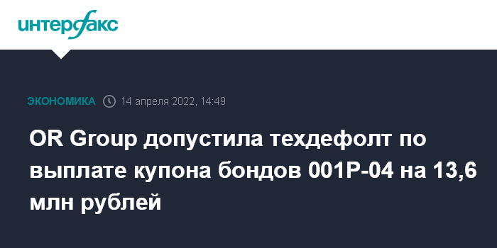 OR Group допустила техдефолт по выплате купона бондов 001P-04 на 13,6 млн рублей