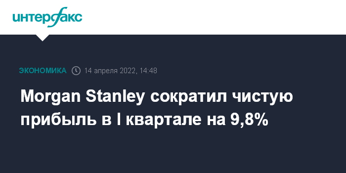 Москва. 14 апреля. INTERFAX.RU - Morgan Stanley, один из крупнейших банков США, сократил чистую прибыль в первом квартале 2022 года на 9,8%, выручку - на 5,9%.