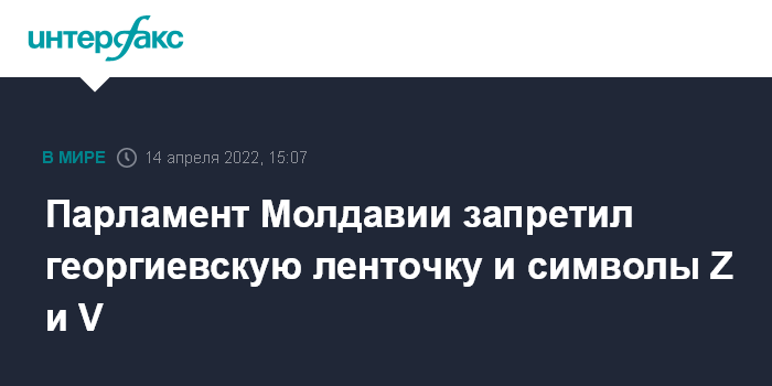 Москва. 14 апреля. INTERFAX.RU - Парламент Молдавии принял в окончательном, третьем чтении законопроект о запрете георгиевской ленты и символов Z и V, которые российские войска используют на Украине.