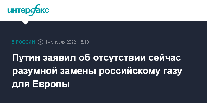 "Попытки западных стран выдавить российских поставщиков, заместить наши энергоресурсы альтернативными поставками неизбежно отразятся на всей мировой экономике. Последствия такого шага могут стать весьма болезненными, и в первую очередь, для самих инициаторов такой политики. Что здесь удивляет: так называемые партнёры из недружественных стран признают, что не могут обойтись без российских энергоресурсов. В том числе, и без природного газа, например. Его разумная замена для Европы сейчас просто отсутствует", - сказал Путин в четверг на совещании, посвящённом ситуации в нефтегазовом секторе.