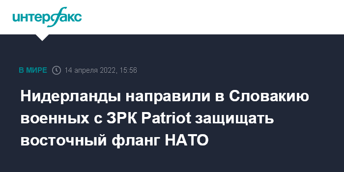Москва. 14 апреля. INTERFAX.RU - Нидерланды направили в четверг в Словакию зенитный ракетный комплекс Patriot и 150 военнослужащих для защиты страны НАТО и ее населения от возможных ракетных атак в связи с ситуацией на Украине. Об этом сообщили нидерландские СМИ со ссылкой на министерство обороны королевства.