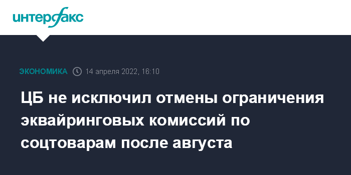 Банк России установил максимальное значение эквайринговых комиссий с 18 апреля до 31 августа 2022 на уровне 1% для компаний, которые продают социально значимые товары или предоставляют такие услуги. Мера была введена, чтобы в текущих экономических условиях дать возможность бизнесу за счет снижения издержек перестроить свою логистику и процессы. Мера распространяется на торговые предприятия, которые занимаются розничной продажей продуктов питания, потребительских товаров и товаров повседневного спроса, топлива, медицинских изделий и лекарственных препаратов. Кроме того, в список вошли компании, оказывающие услуги связи, жилищно-коммунального хозяйства, медицины, образования, культуры, туризма, а также в сфере перевозки пассажиров.