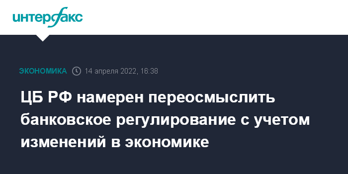Москва. 14 апреля. INTERFAX.RU - ЦБ РФ в будущем намерен переосмыслить регулирование с учетом изменений в экономике и банковском секторе, сообщил первый зампред ЦБ Дмитрий Тулин в ходе заседания рабочей группы по подготовке к рассмотрению годового отчёта.