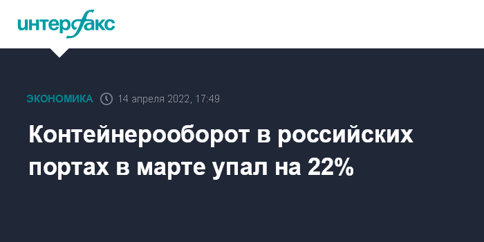 Москва. 14 апреля. INTERFAX.RU - Контейнерооборот морских портов РФ в марте 2022 года составил 385,143 тыс. TEU, что на 21,9% меньше показателя марта 2021 года, говорится в материалах "Морцентр-ТЭК".