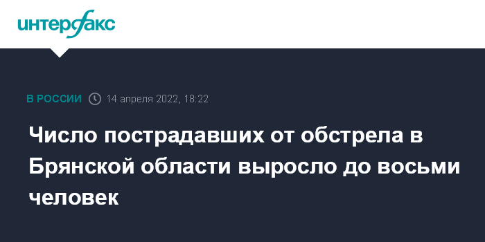 Москва. 14 апреля. INTERFAX.RU - Восемь человек пострадали в результате минометного обстрела территории Климовского района Брянской области, двое из них находятся в тяжелом состоянии, сообщил помощник министра здравоохранения РФ Алексей Кузнецов.