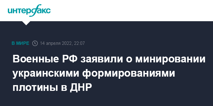 Москва. 14 апреля. INTERFAX.RU - Российские военные заявили, что украинские формирования заминировали плотину в Светлодарске (около 80 км от Донецка).