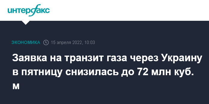 "Газпром" осуществляет подачу российского газа для транзита через территорию Украины в штатном режиме, в соответствии с заявками европейских потребителей - 71,6 млн куб. м на 15 апреля", - сообщил журналистам официальный представитель компании Сергей Куприянов.