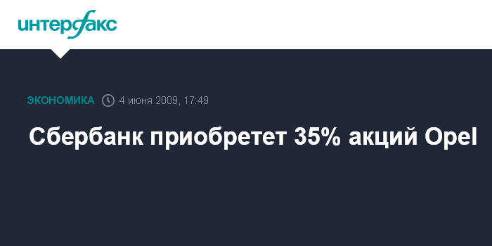 Москва. 4 июня. INTERFAX.RU - Сбербанк станет приобретателем 35% акций Opel, сообщил журналистам глава Сбербанка Герман Греф в Санкт-Петербурге. Он отметил, что российский рынок автомобильного производства обладает мощным потенциалом роста, и соединение возможностей роста производственных мощностей в России с тем потенциалом, который есть у Opel, дает уникальную возможность для того, чтобы решить проблему реструктуризации российского автопрома, а с другой стороны, чтобы помочь в продолжении деятельности Opel.