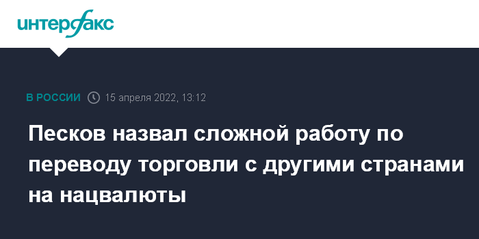 Москва. 15 апреля. INTERFAX.RU - Россия будет переводить торговлю с другими странами на национальные валюты, эта работа достаточно сложная, говорить о том, в какие сроки и по каким товарам, пока рано, заявил пресс-секретарь президента РФ Дмитрий Песков.