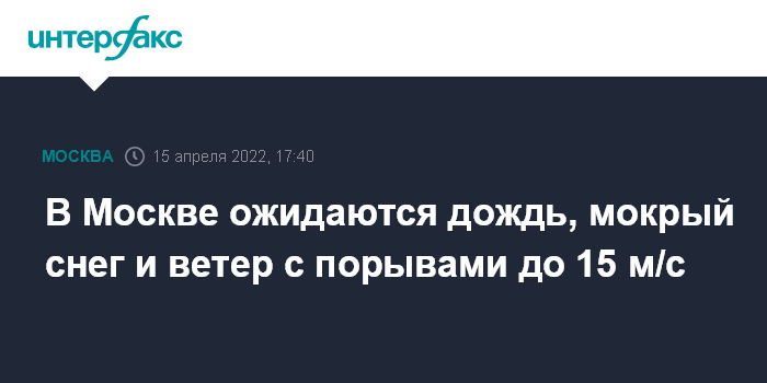 Москва. 15 апреля. INTERFAX.RU - Спасатели предупредили жителей столицы о дожде с мокрым снегом и сильном ветре в пятницу и субботу.