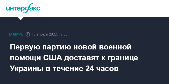 Москва. 15 апреля. INTERFAX.RU - Авиарейс с первой партией военных грузов США для Украины, предусмотренный пакетом помощи на $800 млн, прибудет в регион, как ожидается, в течение 24 часов. Об этом сообщил телеканал CNN со ссылкой на неназванного высокопоставленного представителя Пентагона.