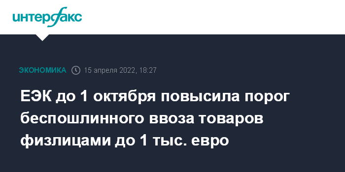 Москва. 15 апреля. INTERFAX.RU - Совет Евразийской экономической комиссии (ЕЭК) повысил беспошлинный порог ввоза товаров для личного пользования в Россию, Белоруссию, Казахстан и Киргизию до 1000 евро и 31 кг, сообщила на брифинге в пятницу помощник председателя ЕЭК Ия Малкина.