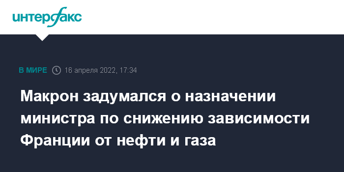 Москва. 16 апреля. INTERFAX.RU - Президент Франции Эмманюэль Макрон заявил в субботу, что рассматривает возможность учреждения министерского поста для организации снижения зависимости страны от ископаемых энергоресурсов.