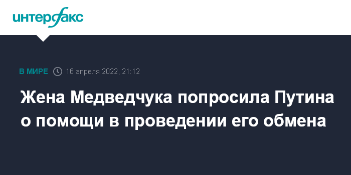 Москва. 16 апреля. INTERFAX.RU - Жена задержанного в Киеве украинского политика Виктора Медведчука Оксана Марченко попросила президента РФ Владимира Путина содействовать обмену ее мужа и ряда других политических активистов.