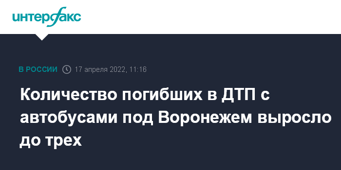 Москва. 17 апреля. INTERFAX.RU - Число погибших в ДТП с двумя автобусами в Воронежской области выросло до трех человек, сообщили "Интерфаксу" в воскресенье в пресс-службе Главного управления МВД России по региону.
