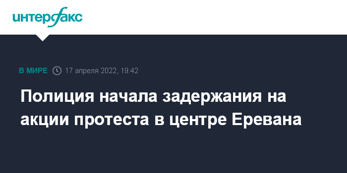 Москва. 17 апреля. INTERFAX.RU - Полиция Армении начала задержание граждан, собравшихся на площади Свободы в центре Еревана по призыву руководителя оппозиционной партии "Отечество", главы парламентской фракции "Честь имею", экс-директора Службы национальной безопасности Армении Артура Ванецяна.