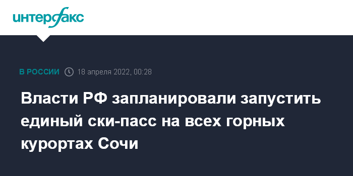 Москва. 18 апреля. INTERFAX.RU - Власти РФ совместно с инвесторами курортов приняли решение о внедрении единого ски-пасса на Красной Поляне в Сочи, координировать работу поручено корпорации "Туризм. РФ", сообщает пресс-служба зампреда правительства РФ Дмитрия Чернышенко.