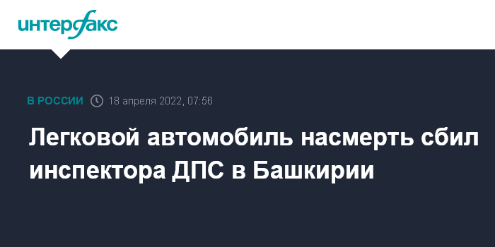 Москва. 18 апреля. INTERFAX.RU - Инспектор ДПС погиб в результате наезда легкового автомобиля в Иглинском районе Башкирии, сообщила пресс-служба МВД по республике в понедельник.