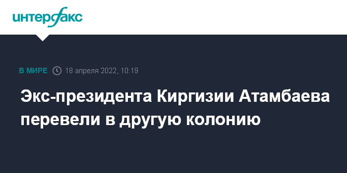 Москва. 18 апреля. INTERFAX.RU - Бывшего президента Киргизии Алмазбека Атамбаева перевели в исправительную колонию общего режима № 27 в селе Молдовановка Аламудунского района Чуйской области, сообщили "Интерфаксу" в Службе исполнения наказаний республики.