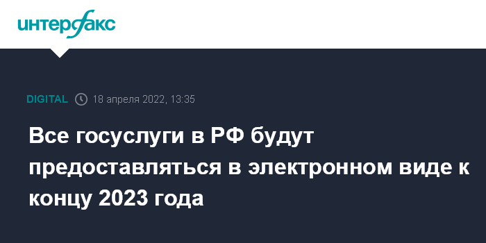 Москва. 18 апреля. INTERFAX.RU - Все государственные услуги к концу 2023 года будут предоставляться в электронном формате, заявил премьер-министр РФ Михаил Мишустин.