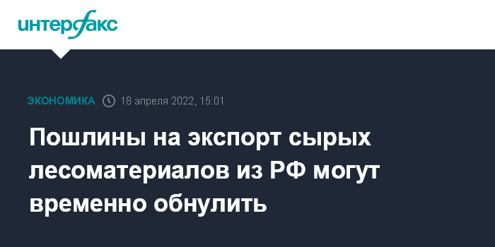 Москва. 18 апреля. INTERFAX.RU - Минпромторг РФ подготовил проект решения о временном снижении экспортных пошлин на сырые лесоматериалы, сообщила директор департамента легкой промышленности и лесопромышленного комплекса министерства Вера Хмырова. В пресс-службе министерства пояснили, что речь идет об обнулении ставки вывозной пошлины на некоторые виды лесоматериалов влажностью более 22%.