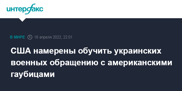 Москва. 18 апреля. INTERFAX.RU - Военные США намерены обучить группу украинских военнослужащих обращаться с передаваемыми Киеву американскими гаубицами, сообщает в понедельник The Hill со ссылкой на неназванного представителя Пентагона.