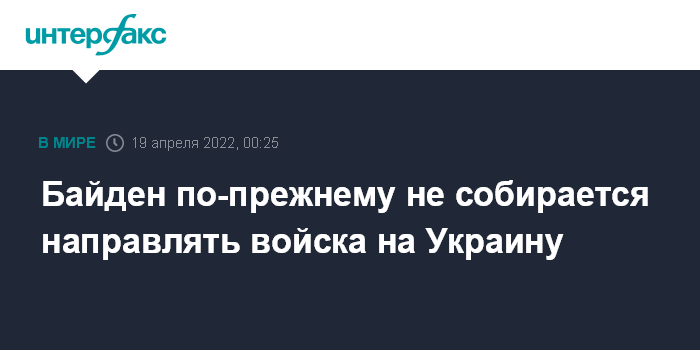 Москва. 19 апреля. INTERFAX.RU - Президент США Джо Байден по-прежнему не рассматривает возможность отправки американских военных на Украину, заявила в понедельник представитель Белого дома Джен Псаки.