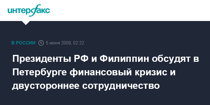 Москва. 5 июня. ИНТЕРФАКС - Глобальный финансовый кризис и двустороннее сотрудничество будут обсуждаться на встрече президента РФ Дмитрия Медведева и президента Филиппин Глории Арройо, которая состоится в пятницу "на полях" экономического форума в Санкт-Петербурге.