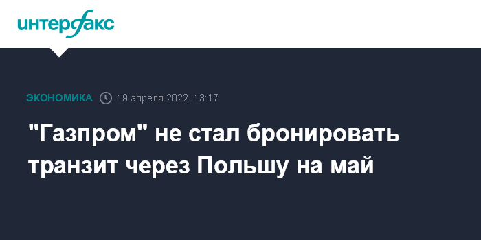 Москва. 19 апреля. INTERFAX.RU - "Газпром" в ходе сессии бронирования газотранспортных мощностей на май не стал выбирать мощности польского участка газопровода "Ямал-Европа", свидетельствуют данные аукциона на платформе бронирования GSA Platform.
