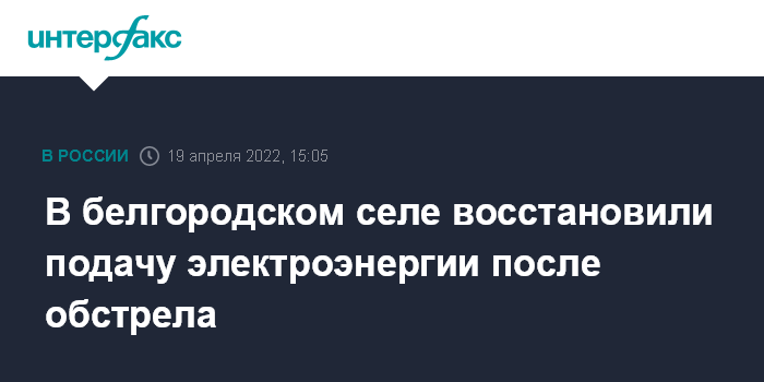 Москва. 19 апреля. INTERFAX.RU - В селе Головчино после утреннего обстрела восстановили электроснабжение после ремонта сетей, сообщил губернатор Белгородской области Вячеслав Гладков.