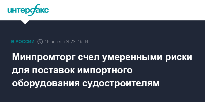 Москва. 19 апреля. INTERFAX.RU - Минпромторг РФ считает умеренными риски непоставки импортного оборудования для строящихся ледоколов, изучает возможности замены иностранного оборудования для транспортных и аварийно-спасательных судов.