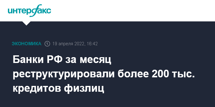 Москва. 19 апреля. INTERFAX.RU - Российские банки за месяц реструктурировали более 200 тыс. кредитов физических лиц, заявил первый зампред ЦБ РФ Владимир Чистюхин на заседании правительственной комиссии по повышению устойчивости российской экономики в условиях санкций.
