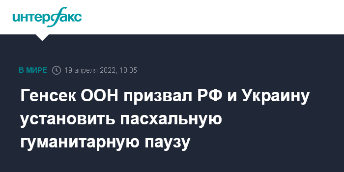 Москва. 19 апреля. INTERFAX.RU - Генсек ООН Антониу Гутерриш во вторник призвал Россию и Украину прекратить боевые действия в страстную неделю с 21 по 24 апреля.
