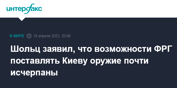 Москва. 19 апреля. INTERFAX.RU - Канцлер ФРГ Олаф Шольц заявил, что Германия изучает список оружия, которое запросила Украина, и планирует "выяснить, что можно поставить быстро", но обратил внимание, что возможности его страны не безграничны.