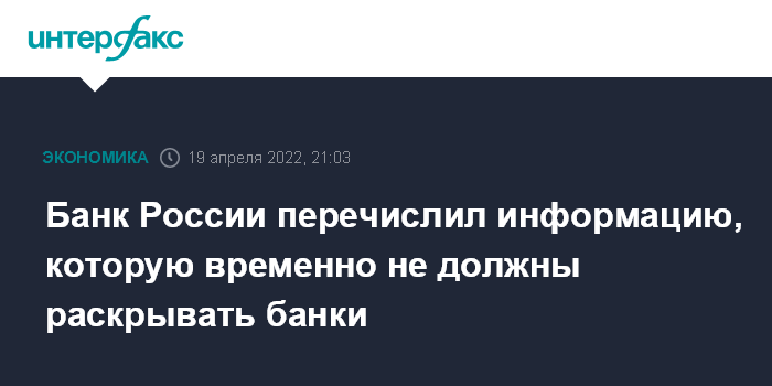 Москва. 19 апреля. INTERFAX.RU - Российские банки временно не должны раскрывать промежуточную и годовую бухгалтерскую отчетность, аудиторское заключение по ней, информацию о принимаемых рисках, управлению рисками и капиталом, данные об инструментах капитала, следует из решения совета директоров Банка России, опубликованного на сайте регулятора.