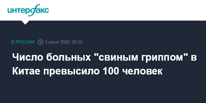 Москва. 5 июня. INTERFAX.RU - Число людей, больных гриппом A/H1N1, в Китае по состоянию на вечер четверга составило 107 человек, сообщило министерство здравоохранения КНР.