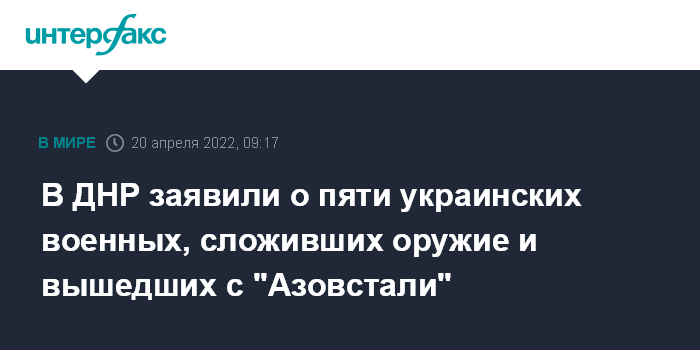 Москва. 20 апреля. INTERFAX.RU - Пятеро украинских военных добровольно сложили оружие и вышли с территории комбината "Азовсталь" в Мариуполе, сообщает народная милиция Донецкой народной республики.