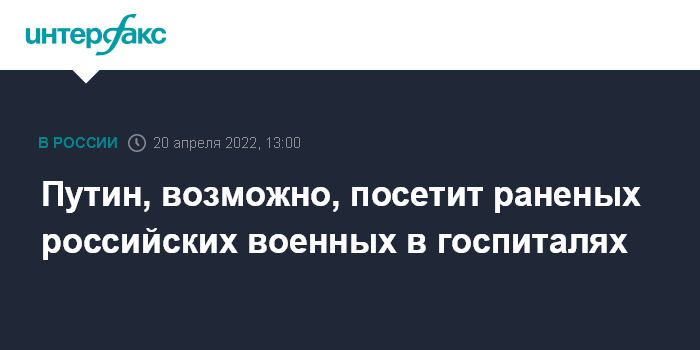 Москва. 20 апреля. INTERFAX.RU - Президент РФ Владимир Путин может посетить в госпиталях и наградить российских военнослужащих, получивших ранения в ходе специальной военной операции на Украине.
