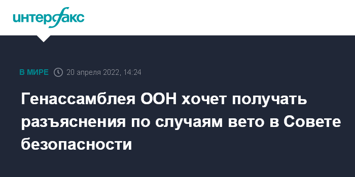 Москва. 20 апреля. INTERFAX.RU - Генассамблея ООН, как ожидается, 26 апреля проголосует по проекту резолюции, наделяющей ее правом получать разъяснения по каждому случаю применения вето постоянным членом Совета безопасности ООН, сообщило в среду агентство "Анадолу".